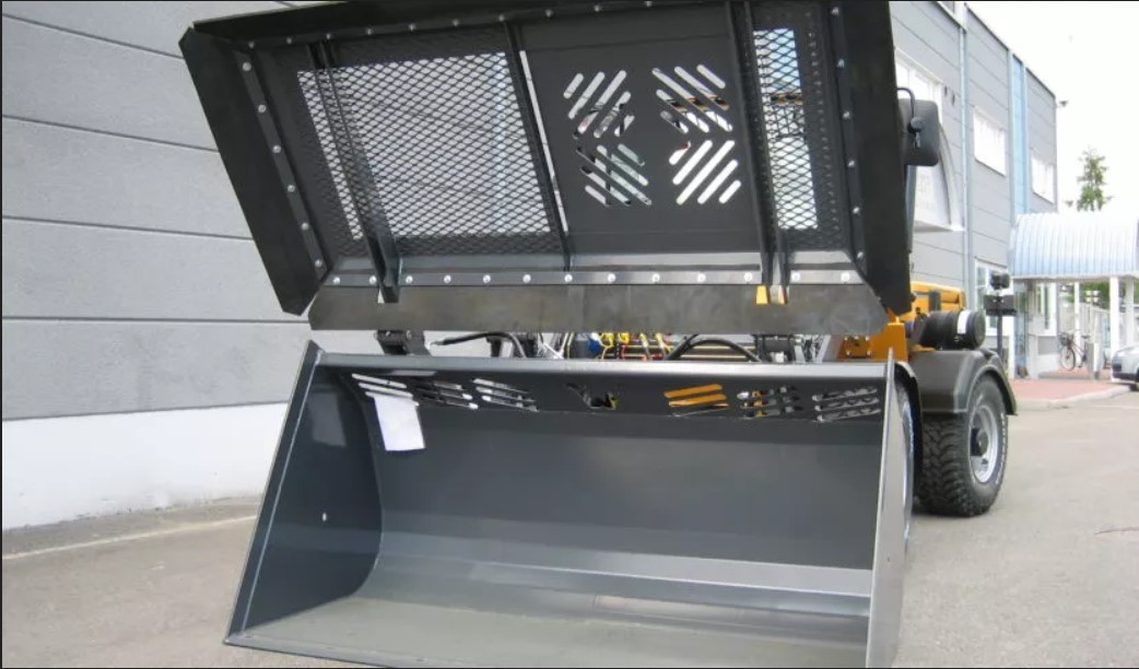 - Ківш обладнаний верхнім люком, що відкривається вручну. Через нього зібраний матеріал можна завантажувати всередину ковша так, щоб він, наприклад, не розлітався від поривів вітру по всій ширині ковша.