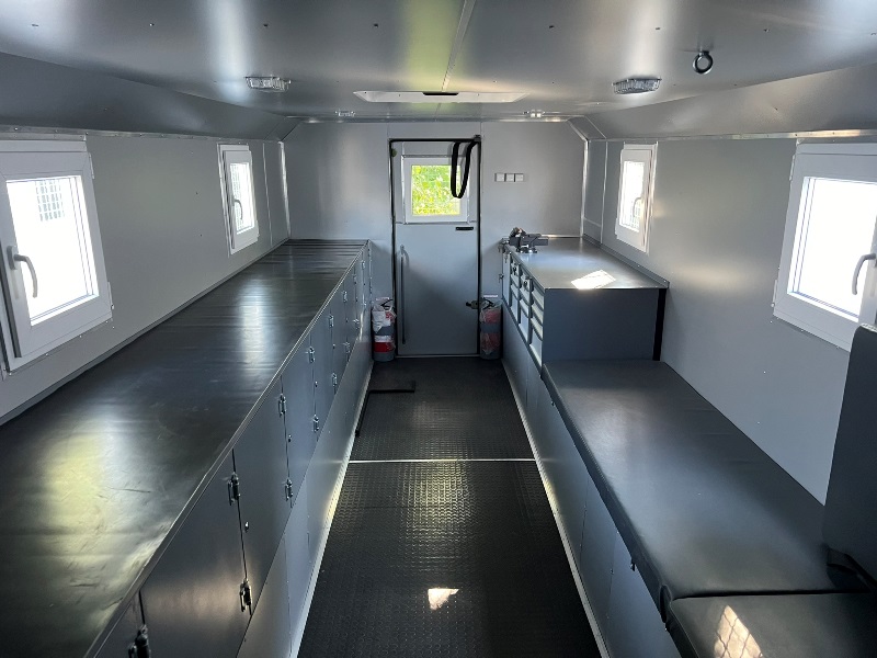 Вхід в приміщення фургона із задньої сторони оснащений висувною драбиною; широкі ступені з перфорованою, перешкоджаючою ковзанню поверхнею і знімним поручнем;