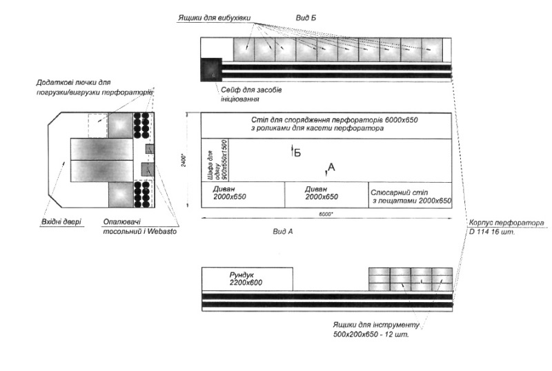 Сейф для зберігання засобів ініціювання (Відповідно до Наказу МВС України № 622 від 21.08.98 (чинний, 20637-98, поточна редакція від 16.02.2016, підстава 20161-16) «Про затвердження Інструкції про порядок виготовлення, придбання, зберігання, обліку, перевезення та використання вогнепальної, пневматичної, холодної і охолощеної зброї, пристроїв вітчизняного виробництва для відстрілу патронів, споряджених гумовими чи еквівалентними за своїми властивостями метальними снарядами несмертельної дії, та патронів до них, а також боєприпасів до зброї, основних частин зброї та вибухових матеріалів» пункт 15.1.5.2. …У передній частині кузова (у правому нижньому кутку) розміщений ящик (відсік) для засобів ініціювання з дверима для їх завантаження із зовнішнього боку кузова. Цей ящик (відсік) зсередини оббитий м’яким матеріалом (гумою, товщиною 5 мм.). Конструкція ящика (відсіку) виключає передачу детонації вибуховим речовинам у випадку непередбаченого вибуху найбільшої кількості засобів ініціювання… ) (ДхВхІІІ) 500x600x650 – 1 шт.